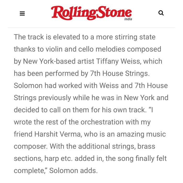 “The song is elevated to a more stirring state thanks to violin and cello melodies composed by New York-based artist Tiffany Weiss, performed by 7th House Strings.”